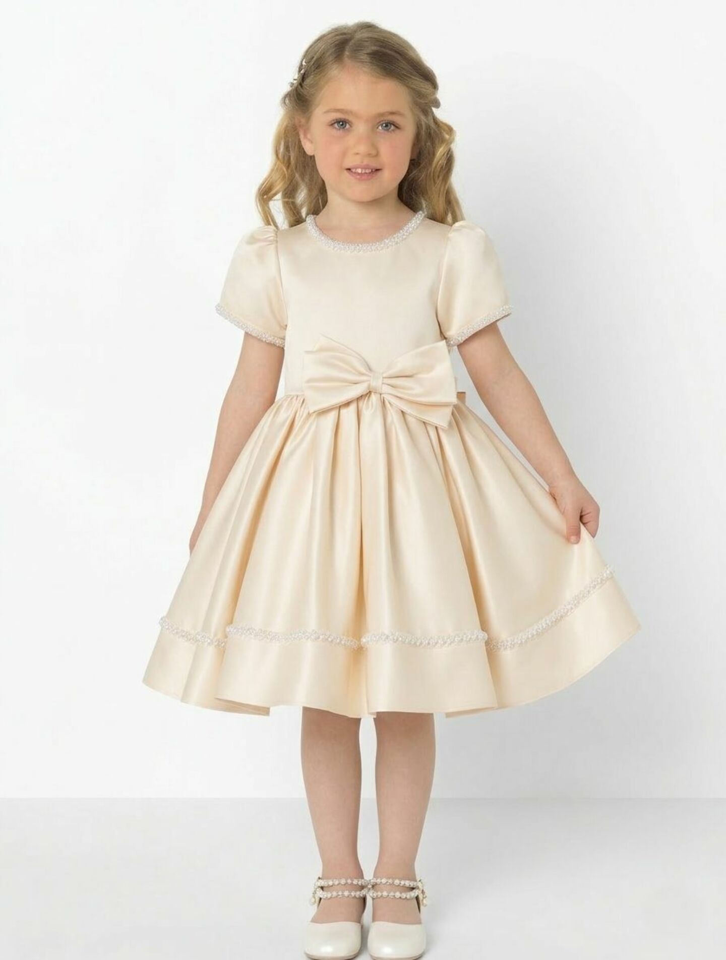 Agnes Champagne Satin Pearl-Trimmed Short Sleeve Young Girls Formal Dress with Oversized Bow | Lucys