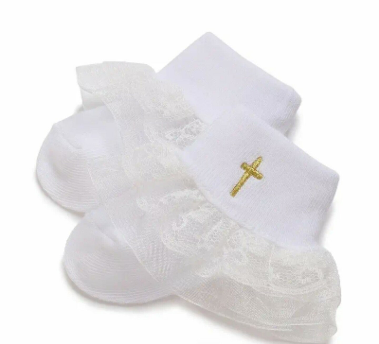 - Product Name: Baby Lace Christening Socks (White with Gold Cross)