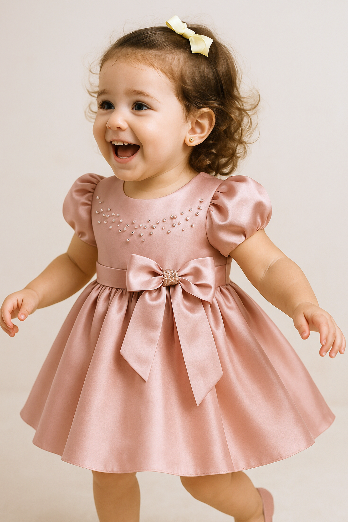 This enchanting pink pearl baby formal dress creates the perfect combination of elegance and comfort for your precious little one. Featuring delicate pearl embellishments scattered across the soft pink bodice, charming puff sleeves, and beautiful bow details at both front and back, this infant formal wear transforms any special occasion into a memorable moment.
