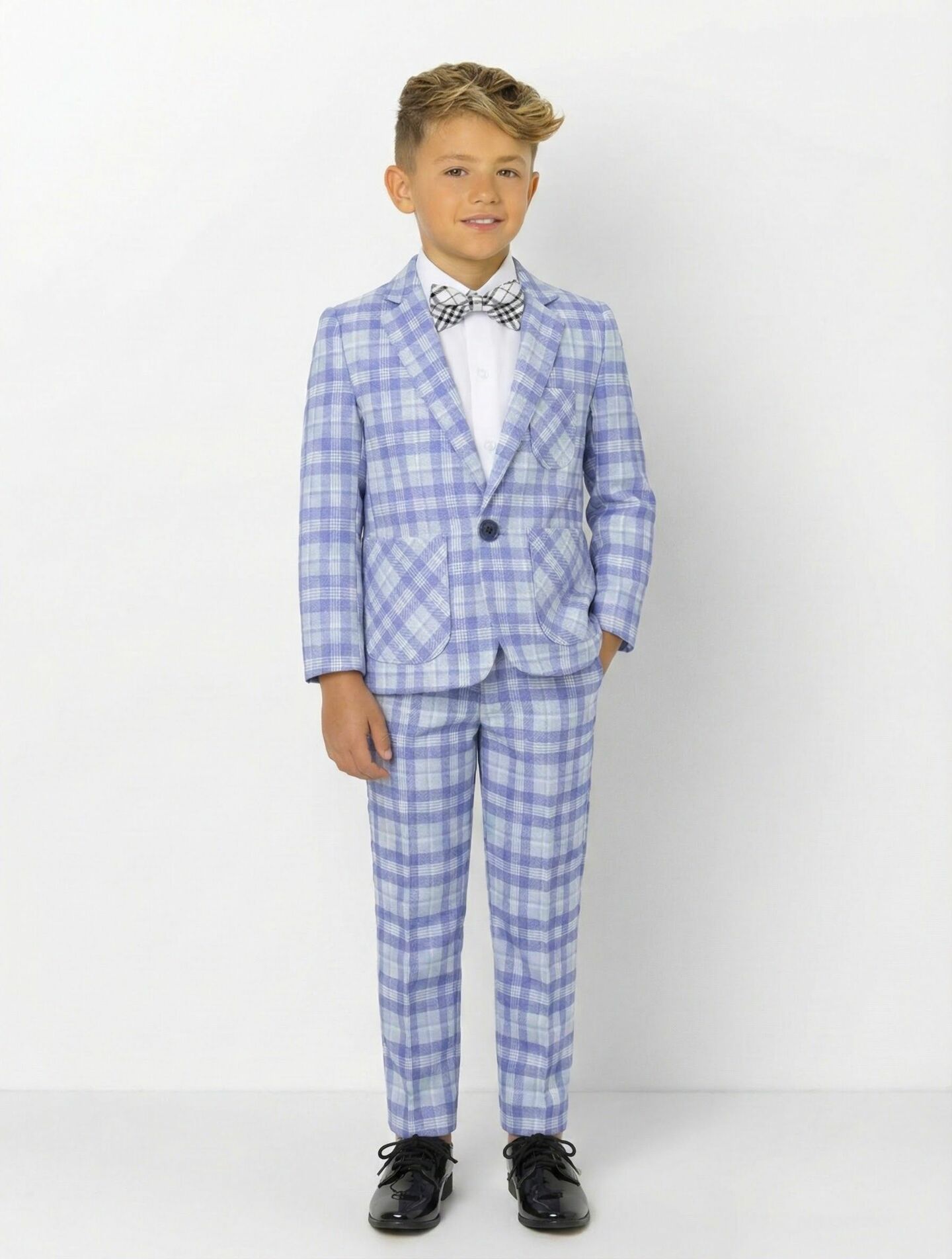 Achieve fresh, contemporary formal style with the Harry 2-piece suit featuring a distinguished light blue lavender plaid blazer with elbow patches paired with coordinating dress trousers. This elegant combination delivers refined formal styling with charming design details perfect for boys attending spring weddings, outdoor ceremonies, and special celebrations.