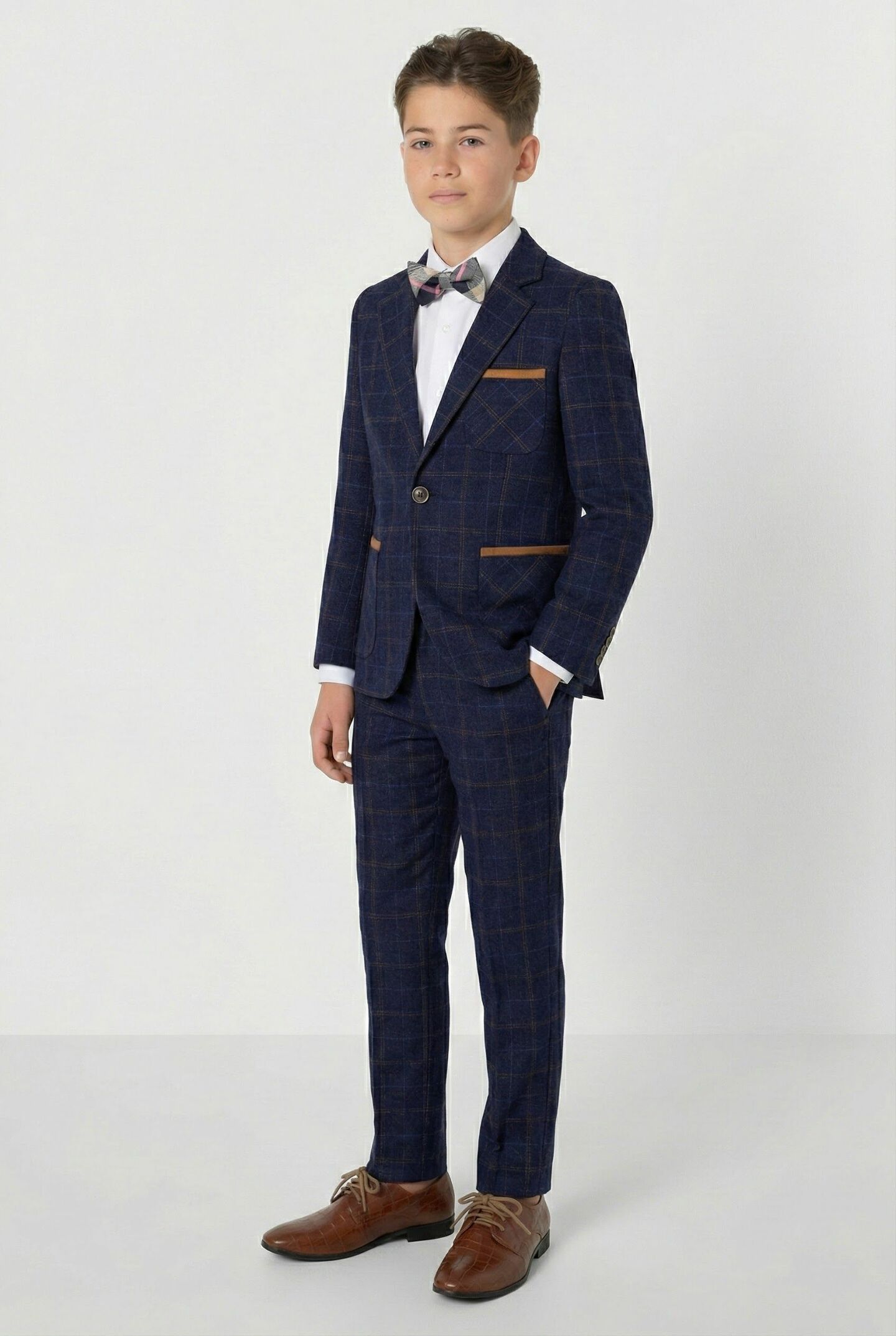 Achieve sophisticated formal style with the Leroy 2-piece suit featuring a distinctive navy windowpane blazer with tan contrast trim paired with coordinating checked trousers. This contemporary combination delivers refined elegance with modern styling perfect for boys attending weddings, formal ceremonies, and special celebrations.