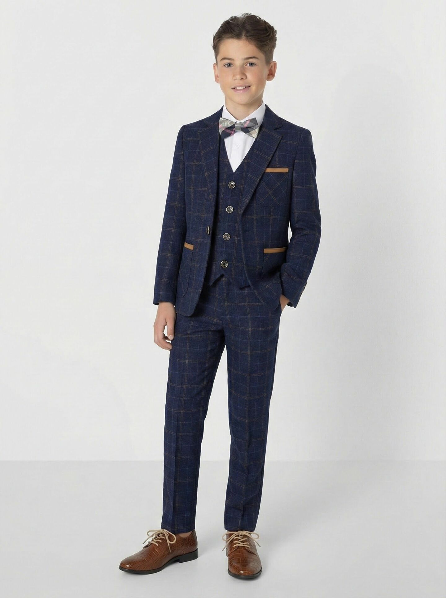 Leroy Navy Windowpane Boys Suit with Tan Contrast Trim 3-Piece Jacket Waistcoat & Trousers | Lucy's