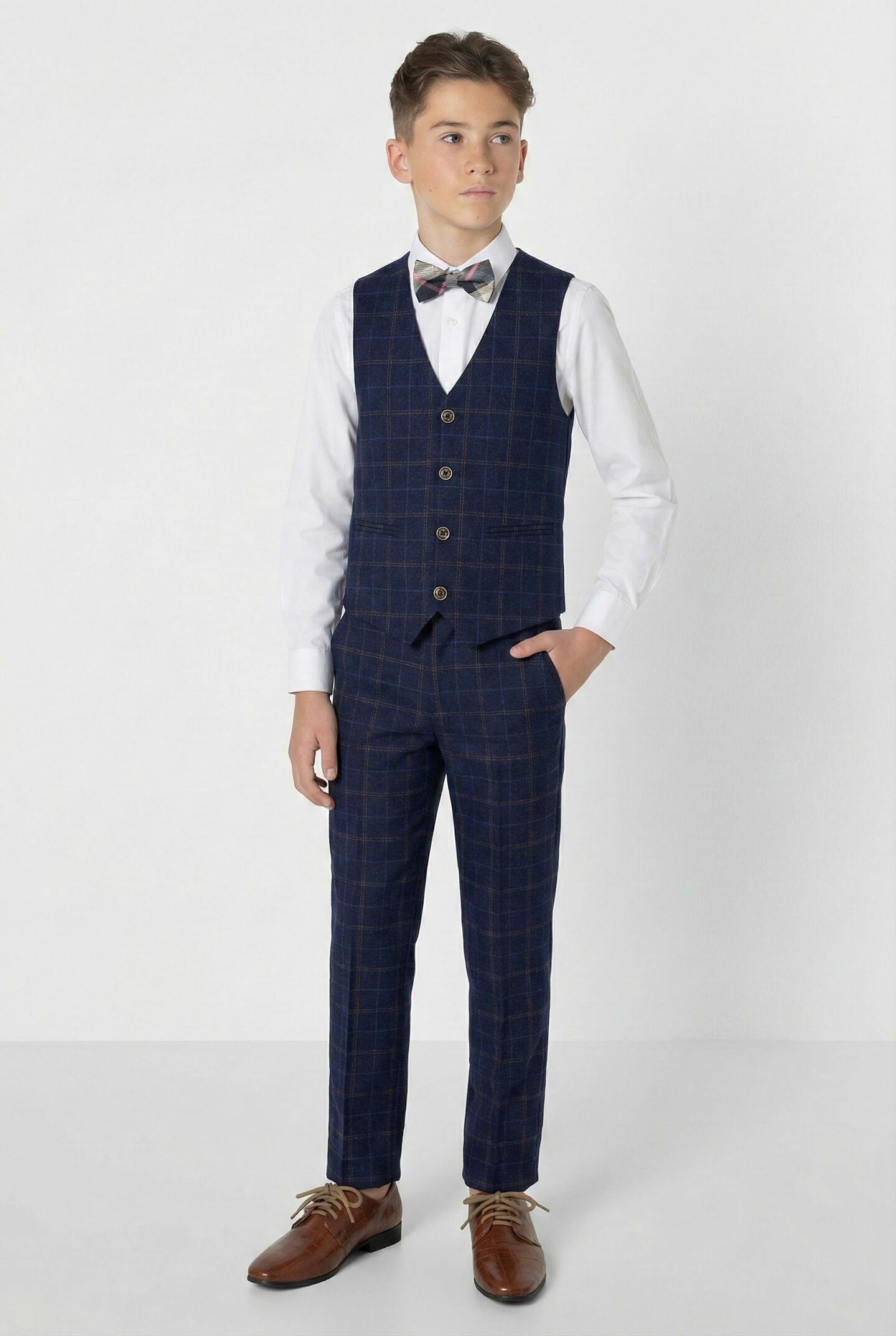 The waistcoat features classic windowpane pattern with adjustable satin back strap for perfect fit, while matching navy checked trousers complete the distinguished ensemble. This versatile set works beautifully on its own for garden parties and summer events, or pairs seamlessly with the Leroy jacket for complete three-piece styling.