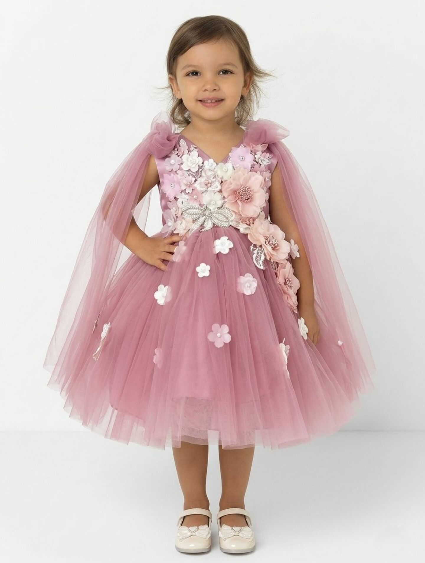 Transform your little one into a fairytale princess with this enchanting dusty pink dress, designed to capture hearts at every special occasion. This whimsical flower girl dress features delicate 3D butterfly and floral embellishments that bring a magical garden aesthetic to life.