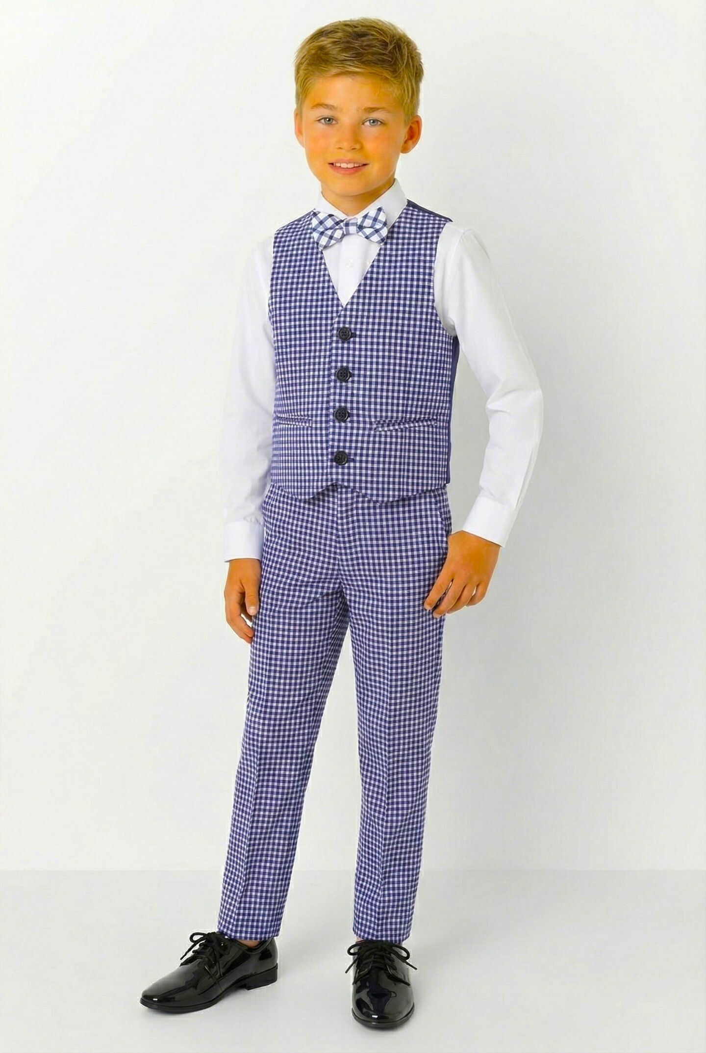 Create refined contemporary style with the Roger 2-piece waistcoat and trouser set in modern blue gingham check. This elegant combination allows boys to achieve polished formal appearance while maintaining comfort for warm-weather celebrations or when jacket-free styling is preferred.